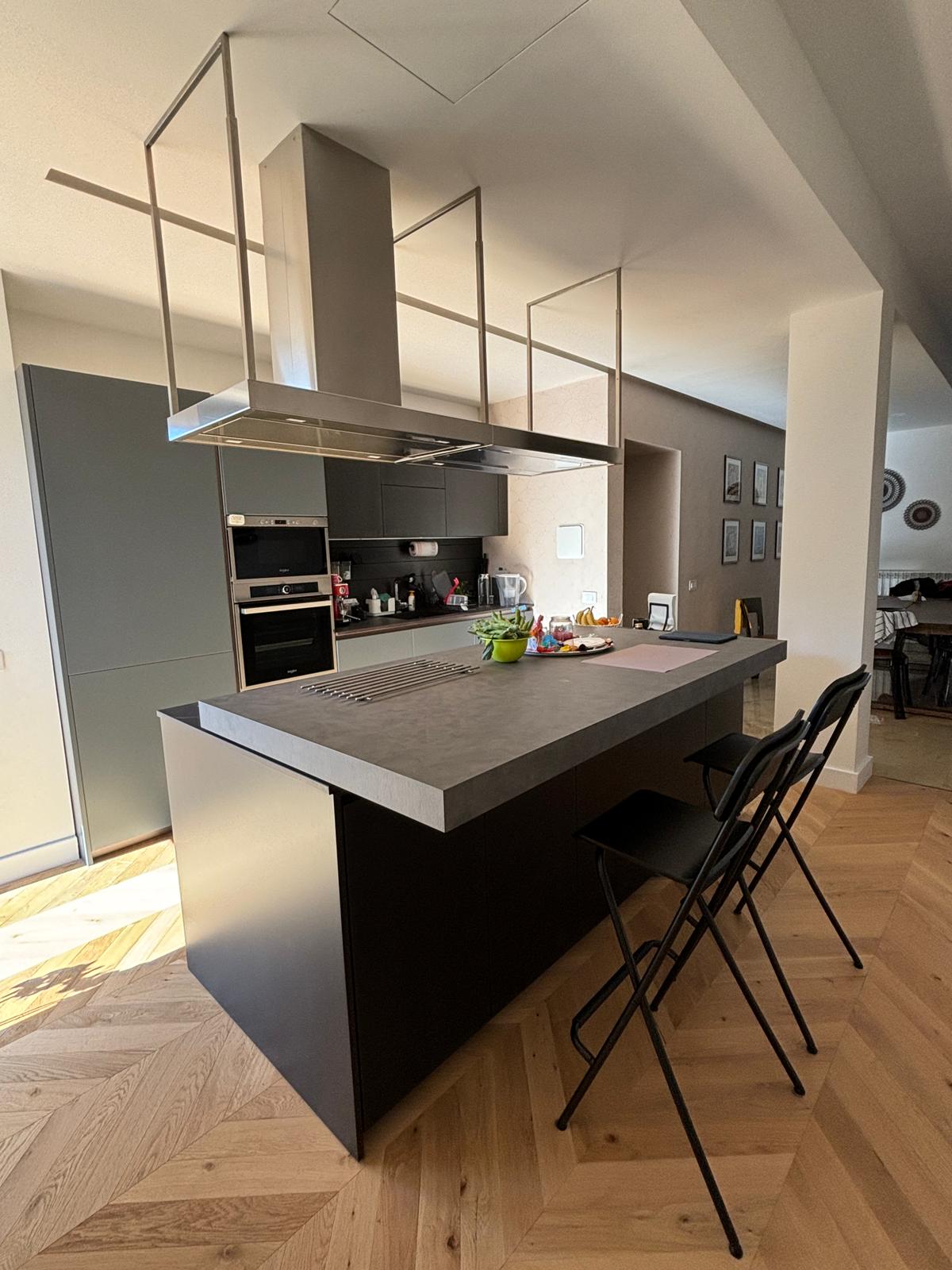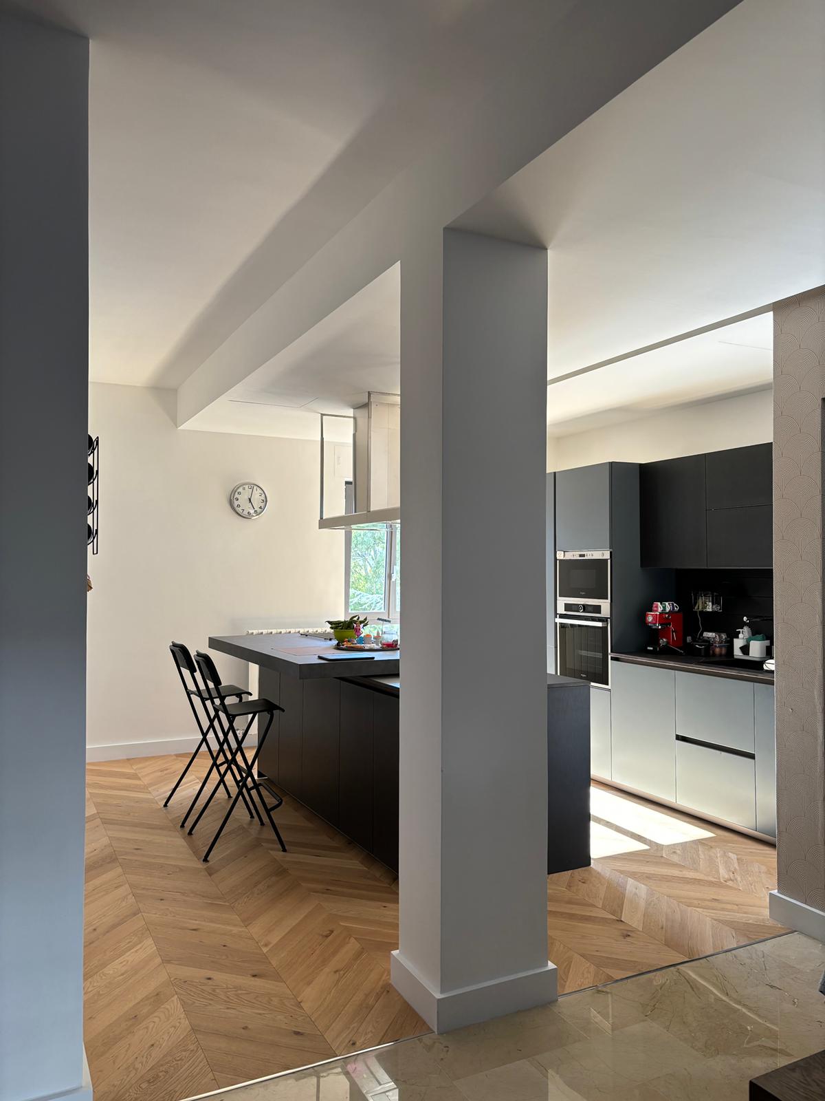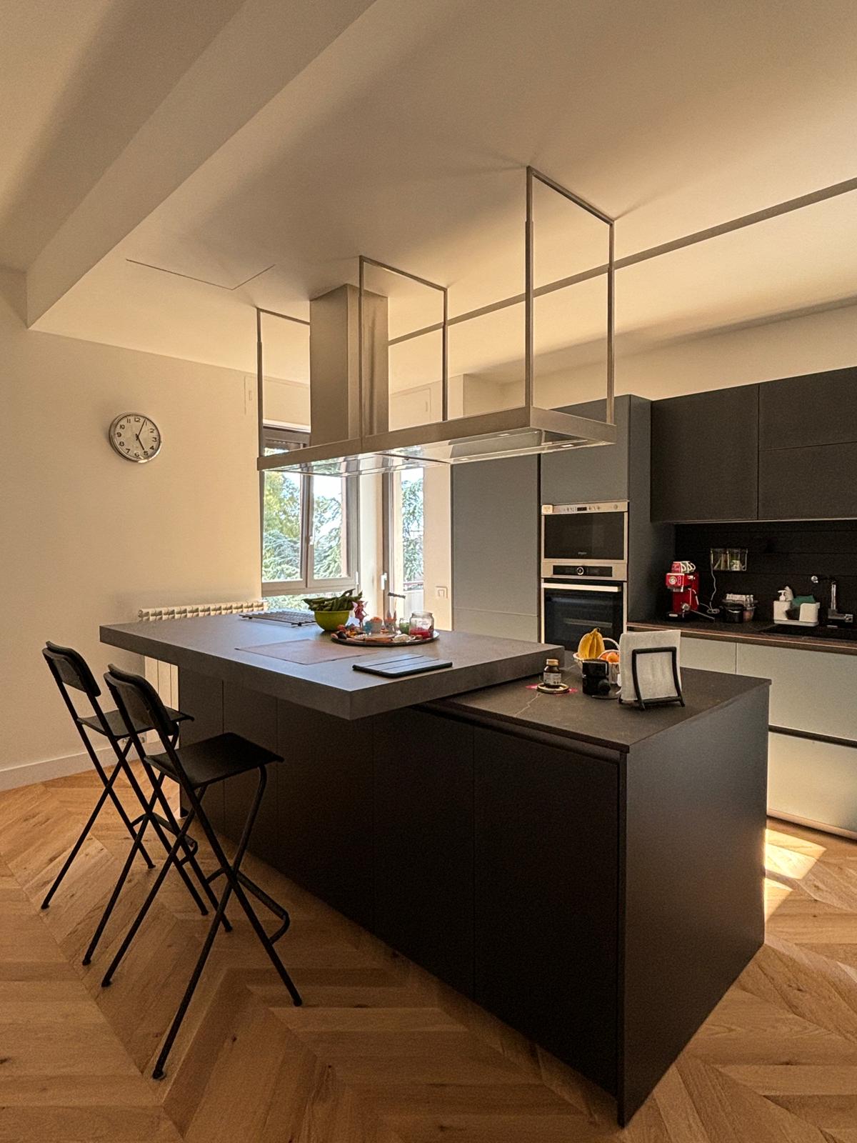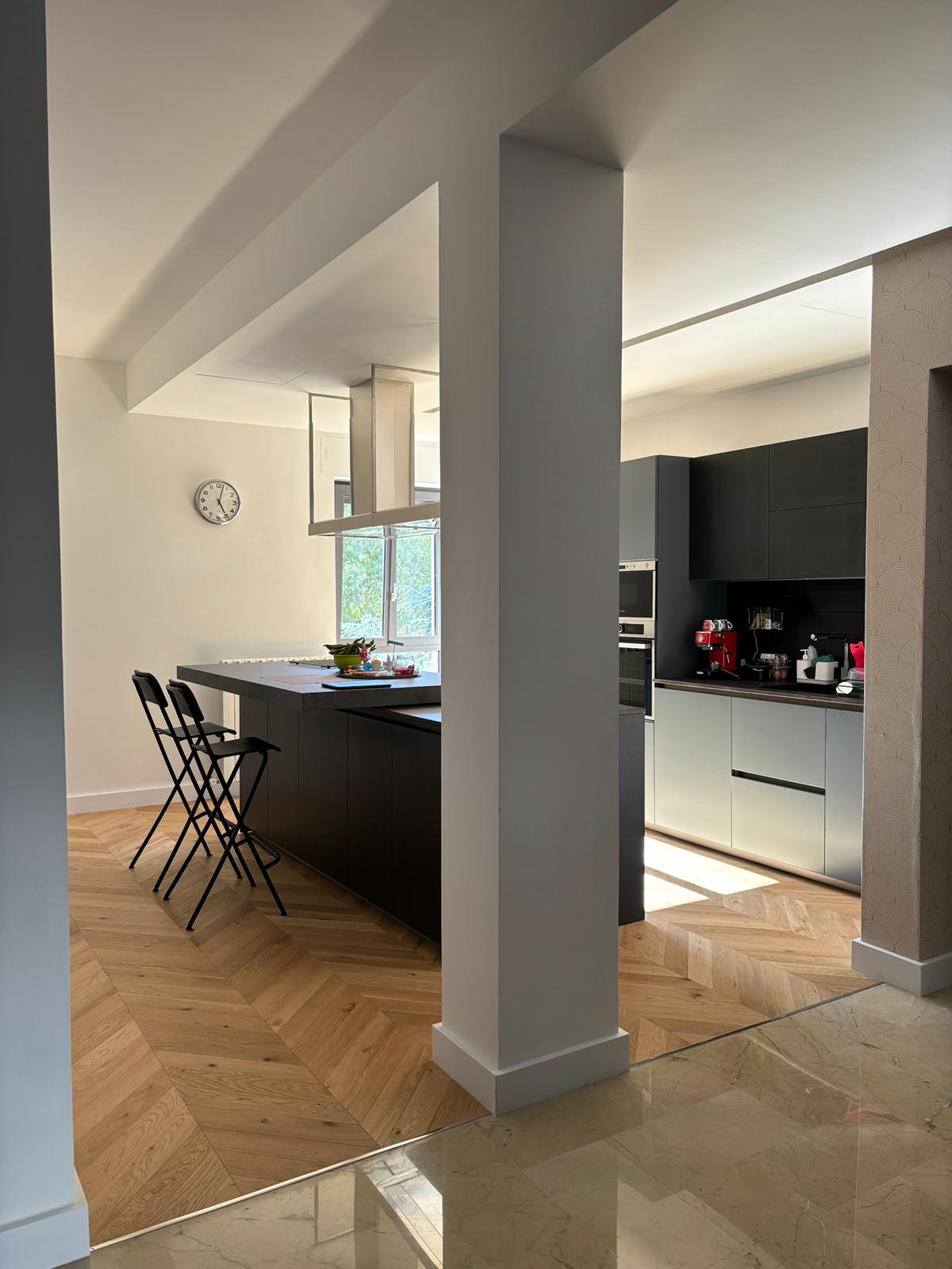 Creazione di un living openspace, con smantellamento della vecchia pavimentazione in gres della cucina e sostituzione con un nuovo pavimento in legno.