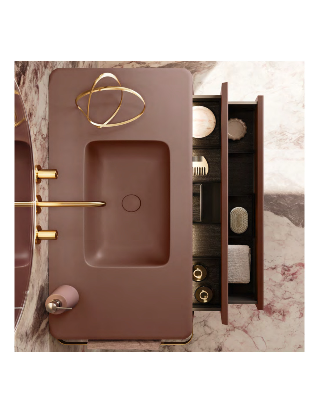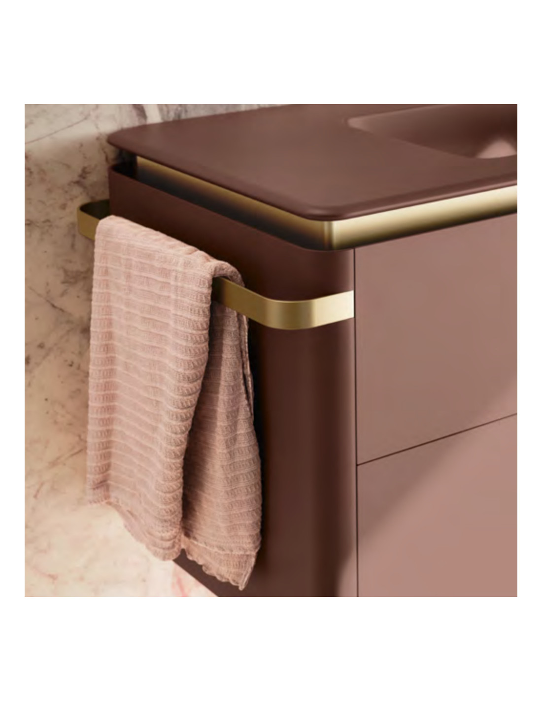 Il fianco del mobile è stondato e integra un portasalviette coordinato in tinta oro come la gola, combinando funzionalità e design. Questa soluzione salvaspazio permette di appendere asciugamani rispettando la linearità del mobile.