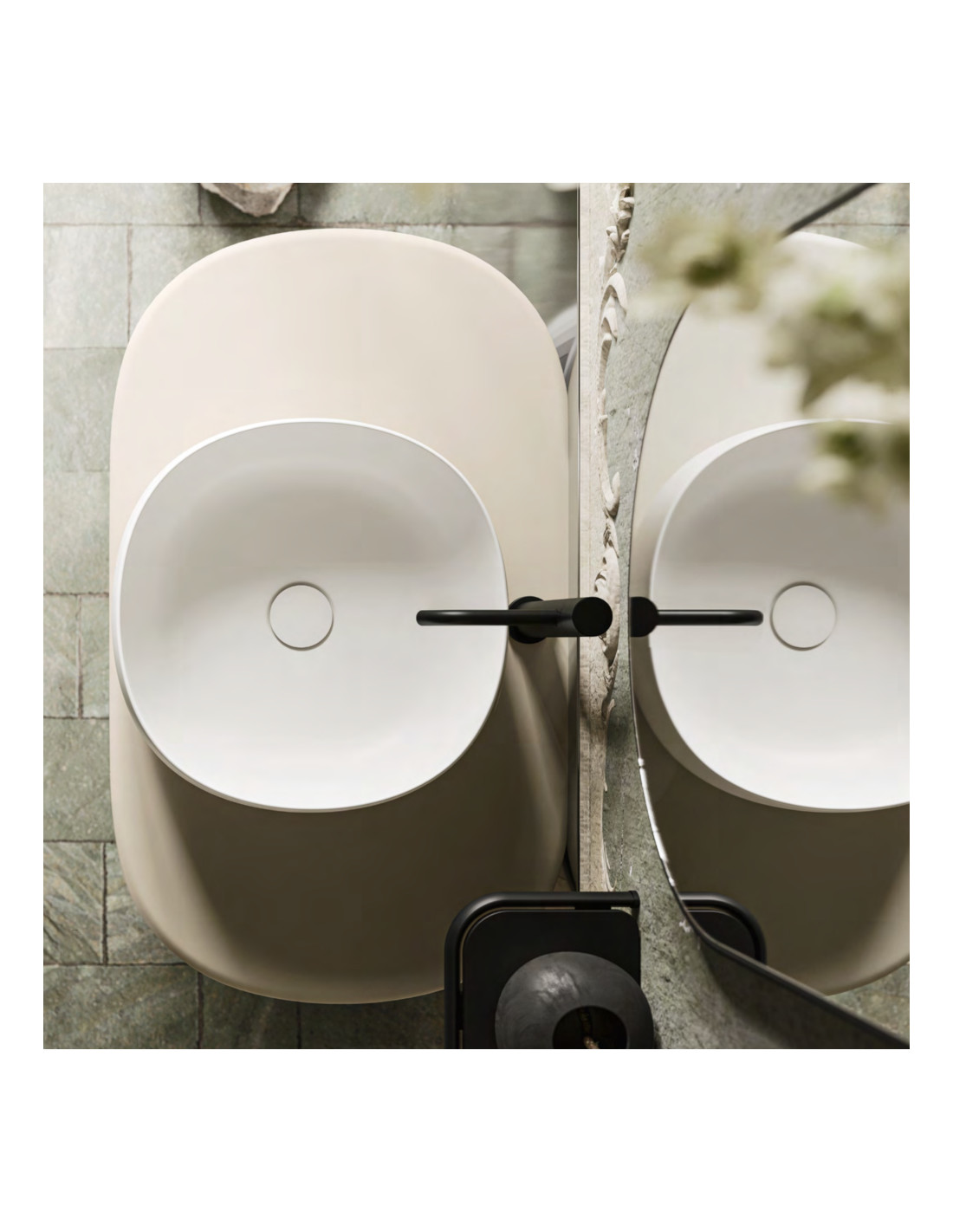 La finitura Laminam Alaska dona luminosità e un carattere naturale alla superficie, mentre il lavabo Almond, dalle forme morbide e proporzionate, si integra alla perfezione con il mobile sospeso. La specchiera App completa la composizione con un tocco essenziale e tecnologico, amplificando la percezione dello spazio.
