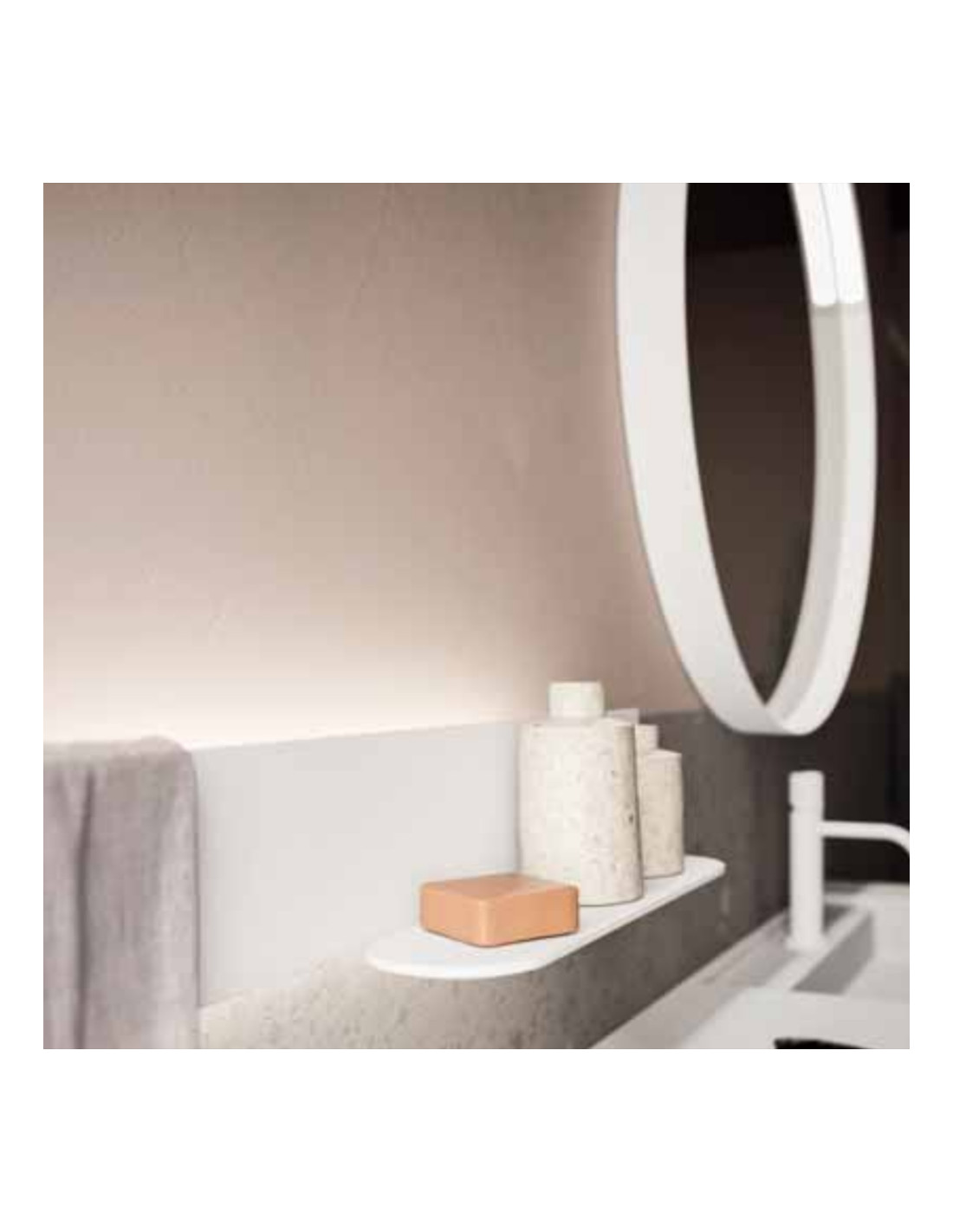 La composizione è progettata per essere installata a muro, con il piano top che può essere montato sopra una base o direttamente sulla parete, a seconda delle esigenze del cliente.