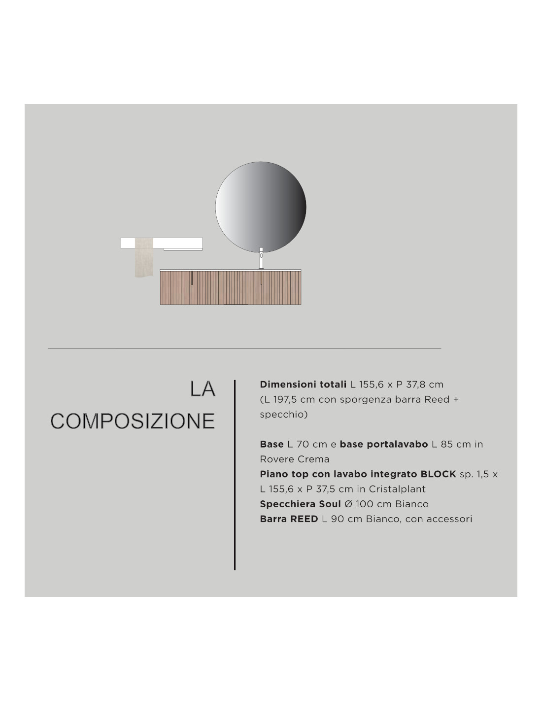 Questa composizione è pensata per chi cerca un ambiente bagno che non solo soddisfi le esigenze pratiche, ma crei anche un'atmosfera di benessere. Ogni elemento è progettato per offrire eleganza, luminosità e praticità con un design che si adatta a qualsiasi stile di bagno.