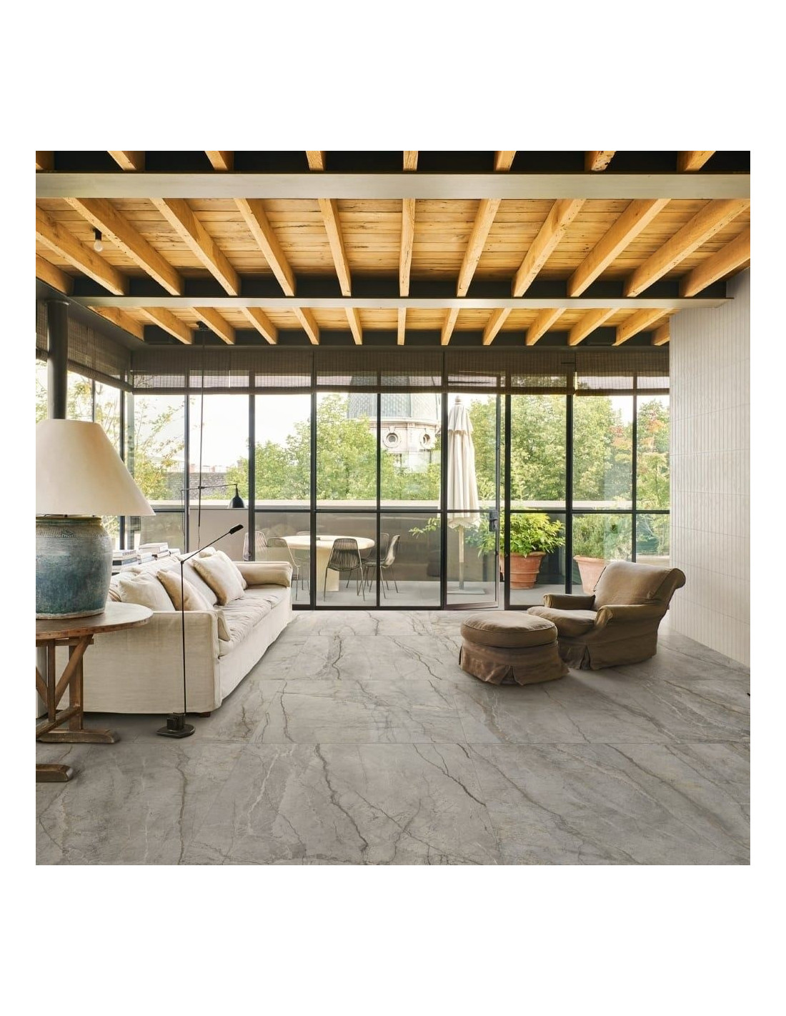 Le piastrelle Marazzi Mystone Silver Root Grey 60X120 rettificate in gres porcellanato effetto pietra con finitura matt uniscono design e prestazioni: assorbimento < 0,5%, alta resistenza a usura e macchie, manutenzione semplice. Perfette per pavimenti interni e rivestimenti coordinati.